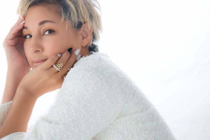 ジャケット¥305,547(by HANA WRIGLEY) デニムパンツ¥27,500(ヤヌーク/カイタックインターナショナル) パールネックレス¥61,600 「あ」 リング¥390,500 「クロス」リング¥389,400(すべてビジュードエム/ビジュードエム六本木ヒルズ) タンクトップ・その他リング/アンナさん私物