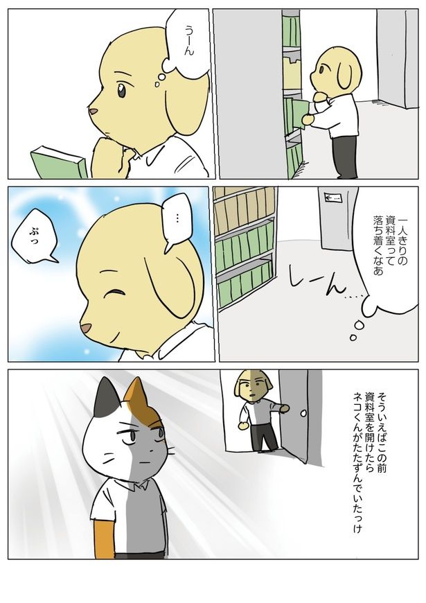 資料室でひとり思い出し笑いをしていたら、誰かに聞かれた!? 必死に咳でごまかすと…/働く!くよくよ犬㊴