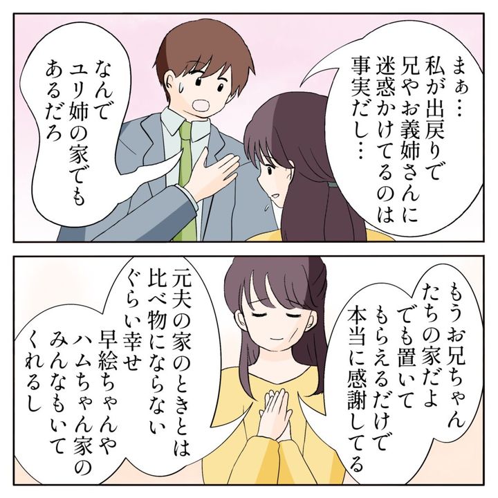 ある日、直帰で仕事を終わらせて家に帰る途中でユリ姉を見かけ、「うちから帰る途中か・・?」と思い声をかけようとすると、近所のおばさんが登場。「子どもも産めずに戻って来たんだから、お兄さんに迷惑かけちゃだめ」だの、「傷物なんだから我慢しないと」だの、「公輔くんの結婚にも障る」だのと言いたい放題。謝るだけで何も言い返さないユリ姉を見て、慌てて間に入り、おばさん達の悪口を我が家への忠告だと受け止めたと伝えると、おばさんたちはそそくさとその場から去って行きました。