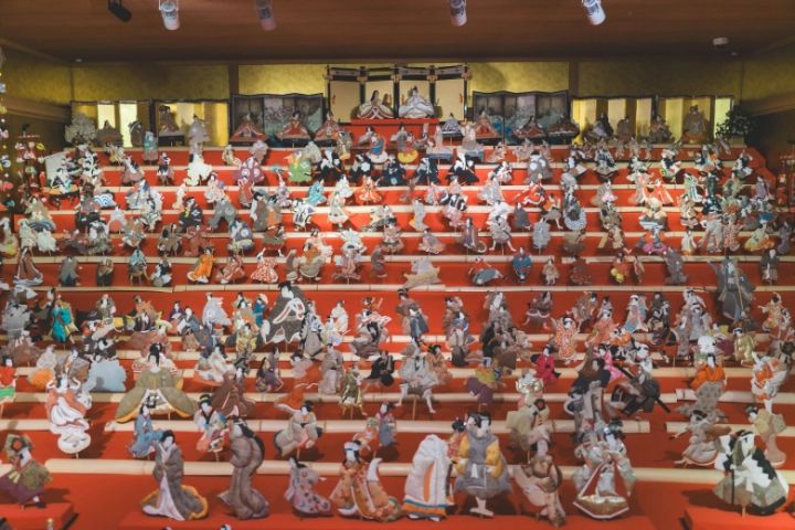 なかでも「ひな人形ミュージアム ひな御殿」は圧巻。約3,800体ものひな人形が並び、時代ごとの装いや表情の違いを間近で感じることができます。200年以上前の人形や、限られた地方にしか残されていない「おきあげ雛」も展示されており、静かな空間の中で数百年もの時を見つめてきた人形たちの、厳かな雰囲気が漂っています。