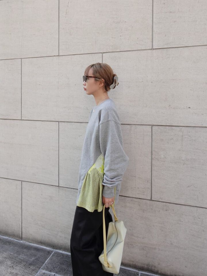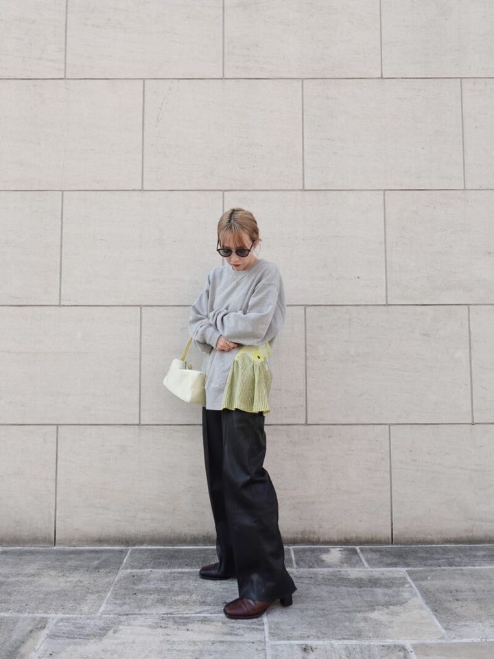 大人でもスウェットを着たいなら、モードなアイテムを取り入れるのが正解! スウェット自体も少しデザイン性の高いアイテムを選ぶと、より洗練されます。スウェットはベーシックなグレーに、ヴィヴィッドなイエローの装飾が施された存在感のある1枚。レザーパンツをあわせて、ハイセンスな大人カジュアルに仕上げています。