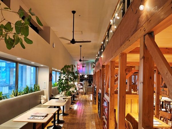ゲートを通ると、木のぬくもりに癒される暖炉ラウンジ。暖炉の向こうには北欧で見えるオーロラのような幻想的なカーテンが揺れ、大宮にいながら北欧旅行気分で寛げます。