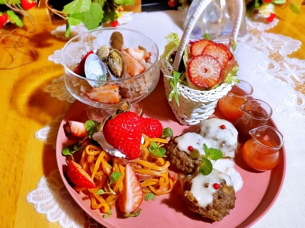 いろいろ食べてみたい方には、4種のいちごメニューが味わえる「あまりんづくしのいちご洋食ワンプレート」。 <左上>いちごで炊いたアサリ入りピラフ <左下>いちごのナポリタンにいちごタバスコを添えて <右上>いちごサラダにいちごドレッシングを添えて <右下>ミートボールにいちごジャムを添えて