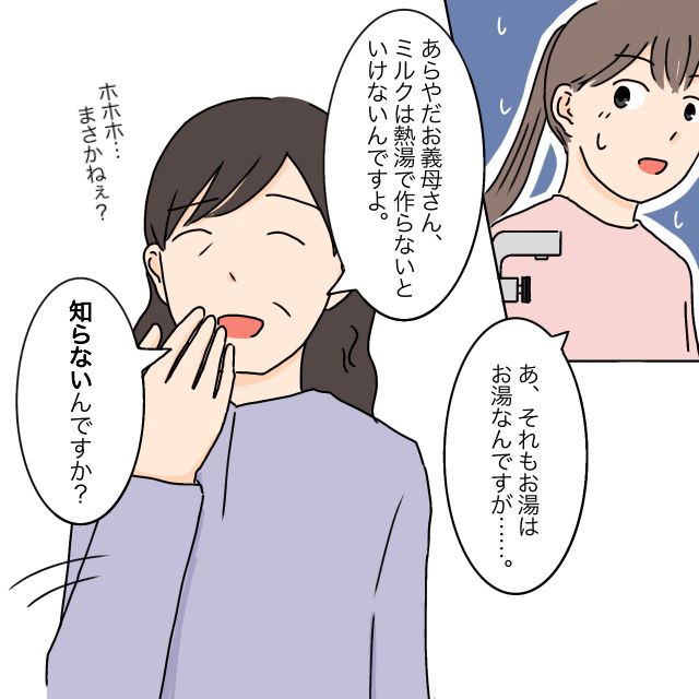 赤ちゃんのミルクをお茶用のお湯で作ればいいとさらりと言われ「あ、それもお湯はお湯なんですが・・」と困惑していると、「あらやだお義母さん。ミルクは熱湯で作らないといけないんですよ。知らないんですか?ホホホ・・まさかねぇ?」と満面の笑みで義母が義祖母にマウント発言。たしかに温度が心配だった私は義母がズバッと言ってくれてありがたかったのですが、お義母さんも何もそんな棘のある言い方しなくても・・とヒヤヒヤでした。