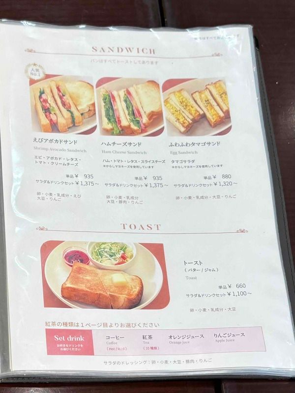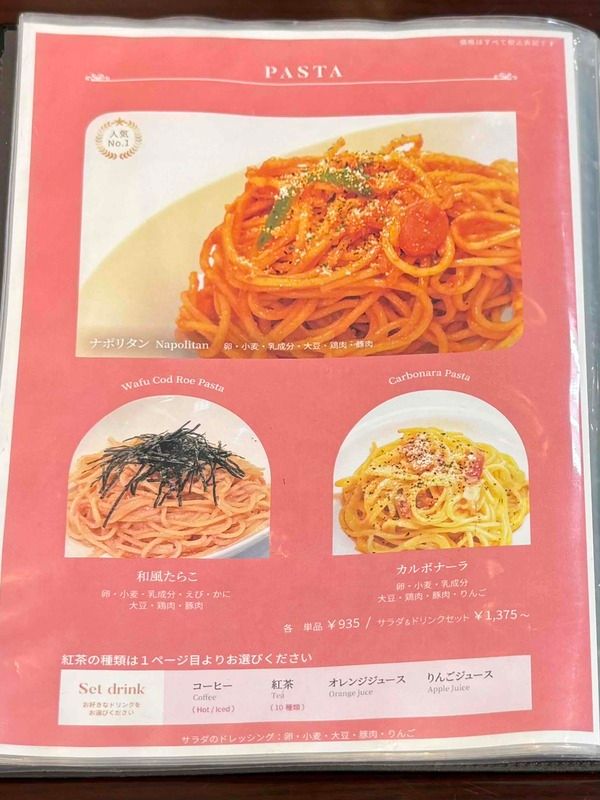 お食事(パスタやトースト)にはサラダ&ドリンクを440円でセットにできます。ドリンクは10種類の紅茶・コーヒー・2種類のジュースからセレクト可能。紅茶は単品で715円のため、とってもお得に楽しめます。