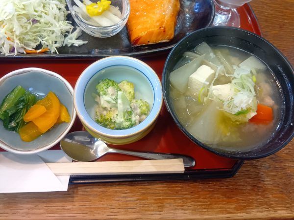 溢れんばかりの根菜の味噌汁に、ブロッコリーのマヨ和え、お漬物。