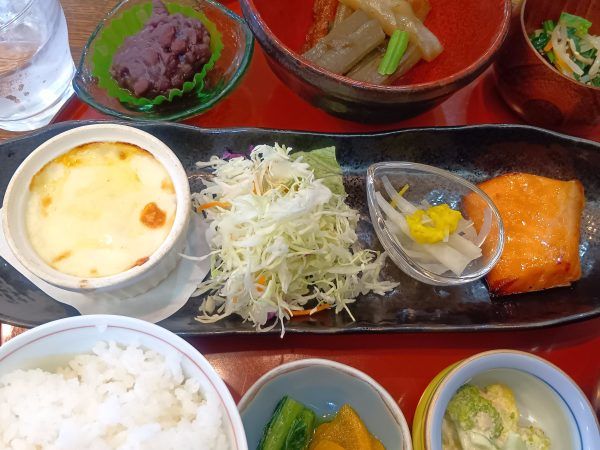 グラタンは具材たっぷりでとろとろ旨々。脂ののった焼サーモンに、酸味控えめのなますが抜群の相性。