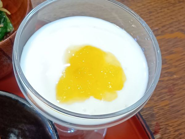 ジュレ感あるフルーツソースがかかった、とろ〜りヨーグルト。