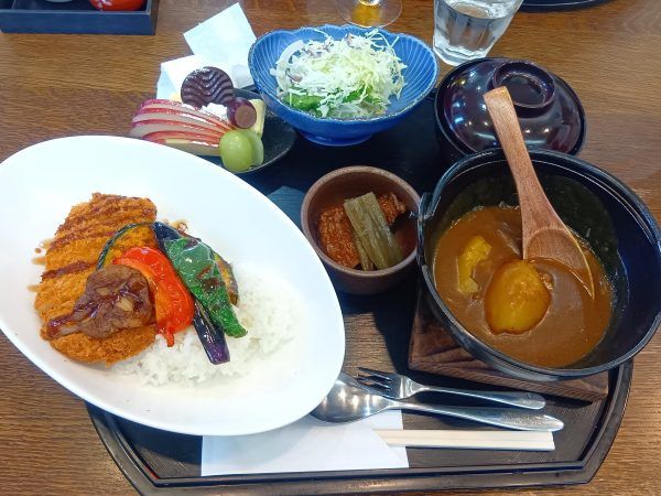 私も迷って、友人がオーダーした「カツカレーランチ」も、カツやグリル野菜、具材ごろごろカレーと、こちらも美味しい〜と絶賛でした。