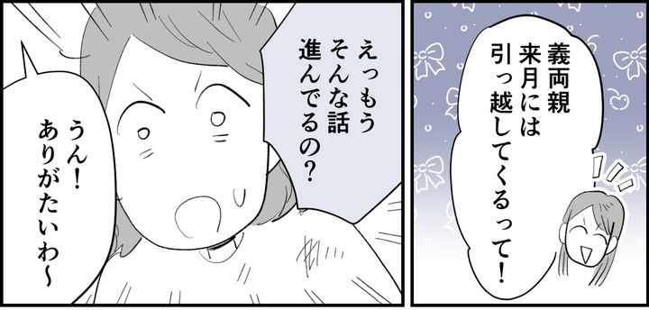 私はムツキ。父はすでに亡くなっており、母の強い希望を受けて夫のシンジと共に同居しています。週末に突然やってきた妹のエミリから、エミリの義両親が近くに引っ越してくることを告げられました。「育児要員ゲット」と喜ぶ彼女に、私は自分の生活圏に入り込まれることへの抵抗を感じたのです。でも、「神経質すぎる」のひと言で一蹴されてしまいました。夜、母に相談しましたが、またもや「考えすぎ」と軽くあしらわれる始末。2人が言う通り、私が神経質すぎるのでしょうか……。もし本当にエミリの義両親が近くに引っ越してきたとしたら、これからどうなるのかと不安が消えません。