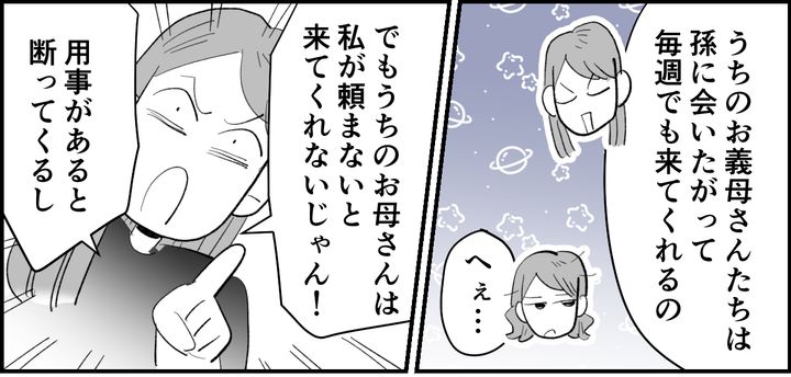 「前から思ってたんだけどさ……」と切り出され、エミリは母と私にクレームを入れてきました。私たちの孫や姪たちへの関わり方に不満があるそうです。頼まないと来てくれない私と母、それに引き換え、孫に会いたくて会いたくてたまらないとたくさん会いに来てくれる義両親を比べられてしまったのです。