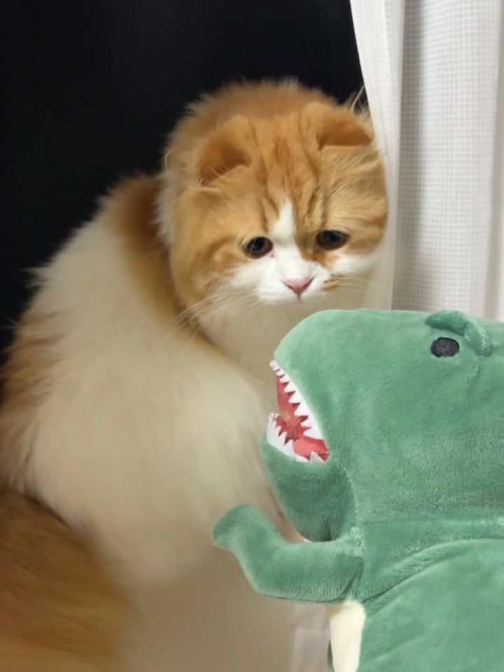 ぬいぐるみの恐竜が口をパクパクさせて兄弟猫に急接近!怖いよ~と言わんばかりの兄猫『ガブ』ちゃんと、なんだなんだと好奇心旺盛な弟猫の『ラテ』ちゃんの様子に、思わずクスっとしちゃうかわいさです♡