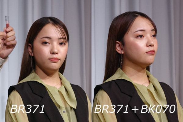 続いて、秋冬に使いたくなる落ち着いたブラウンカラーの「BR371 ウッディブラウン」を使用したモデルには、「BK070 ブラックベリー」をプラス。黒だけではなくほんのりと赤みを含んだカラーであるため、トーンダウンしながら赤みも足されます。ぐっと大人っぽい感じの印象になり、1本持っておくとさまざまなシーンで役立ちそう!