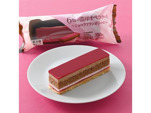 コーティングチョコ・チョコムース・ココアスポンジ・フランボワーズムース・フランボワーズジュレ・クランブルの6層で仕立てた濃厚なオペラケーキです。 [ファミリーマート限定]