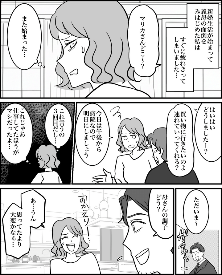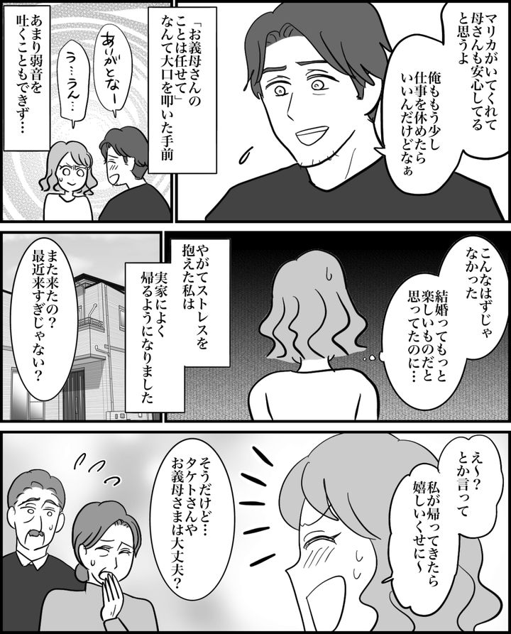 私はマリカ。今から3年ほど前、友人たちの結婚ラッシュに焦りを感じていた私は、付き合っていたタケトに逆プロポーズしました。タケトが結婚に躊躇するのは、病気がちで日常的にサポートが必要なお母さんがいるから。私は「専業主婦になって同居して、全面的に面倒をみるから」と言ってなんとか結婚に漕ぎつけたのです。結婚を「ゴール」に設定していた私は幸せいっぱいでした。しかし当然ながら、本当の結婚生活はここから始まるわけで……?