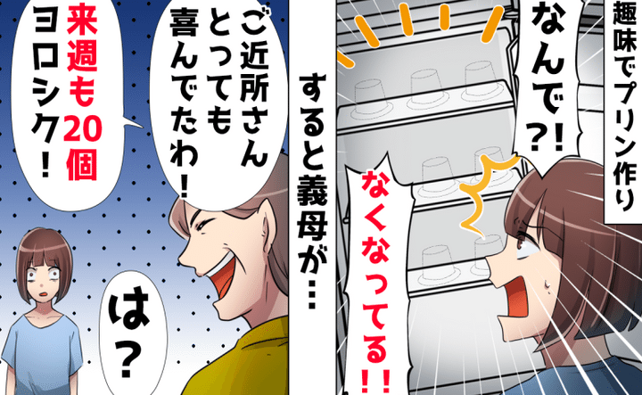 夫人はご近所に住んでいることもあり、以前から義母とはお茶を飲み交わすほど仲の良い間柄でした。義母は夫人の前でいい格好をしたいあまり、自分の手作りプリンだと嘘をついてしまった様子。とはいえ、高級な材料はそう簡単に手に入りませんし、そもそも義母は材料費を出す気もなさそうでした。
