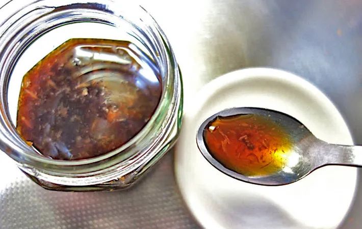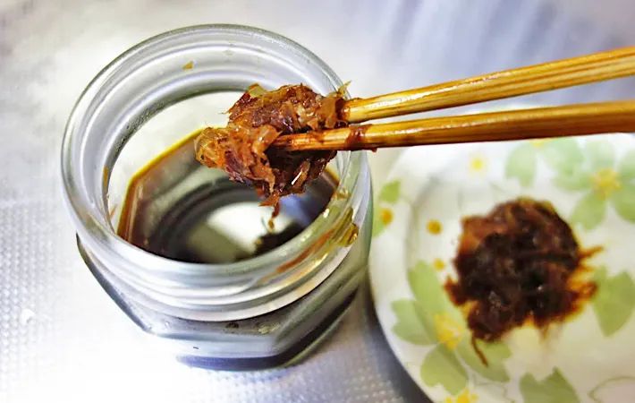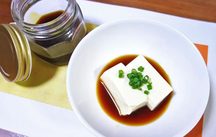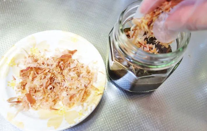 冷蔵庫から取り出し、かつお節を取り除きます。