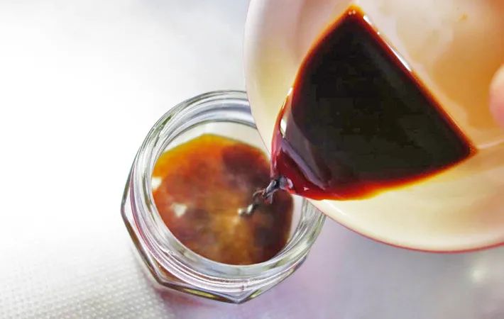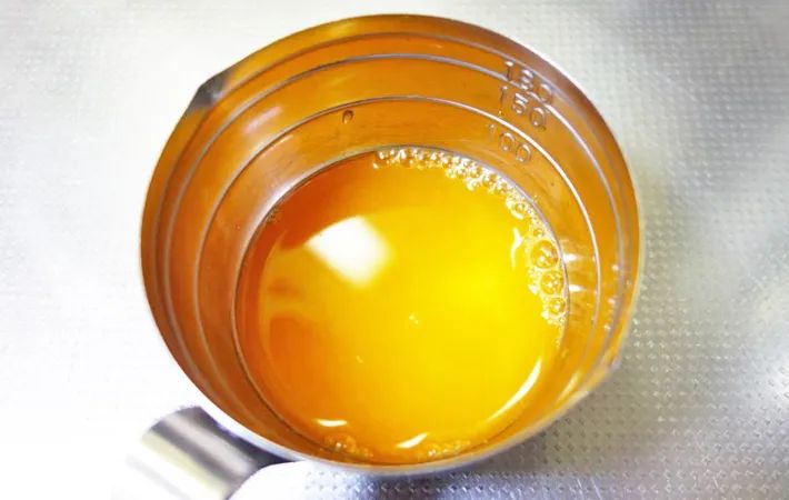 果汁を容器に移し、酢と醤油を加えて混ぜ合わせます。