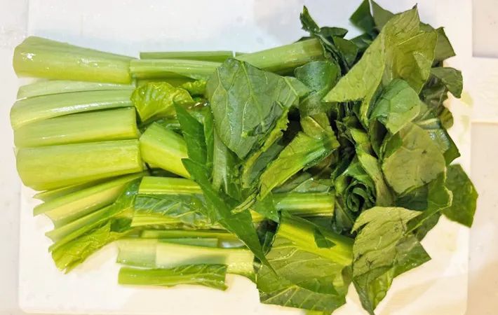 最後に小松菜の葉も加えて、さっと炒めたら、焼き肉のタレとごま油を入れて味をなじませます。