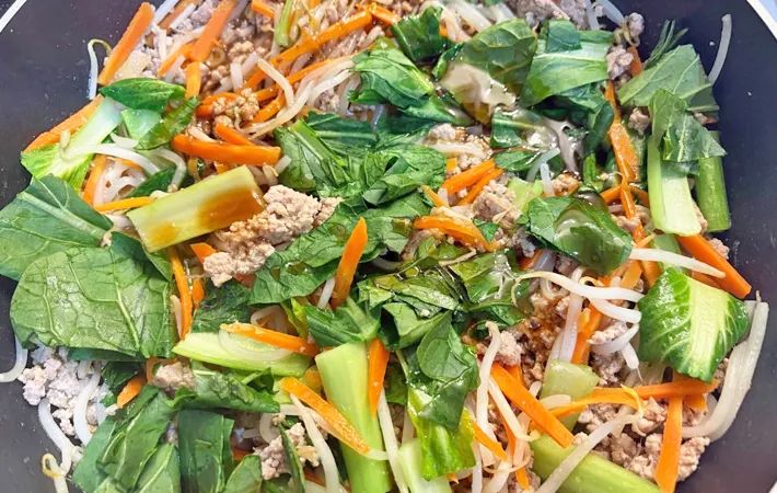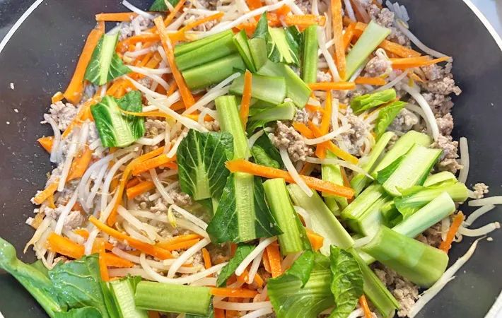 ニンジンとモヤシがしんなりしてきたら、小松菜の芯部分を加えてください。