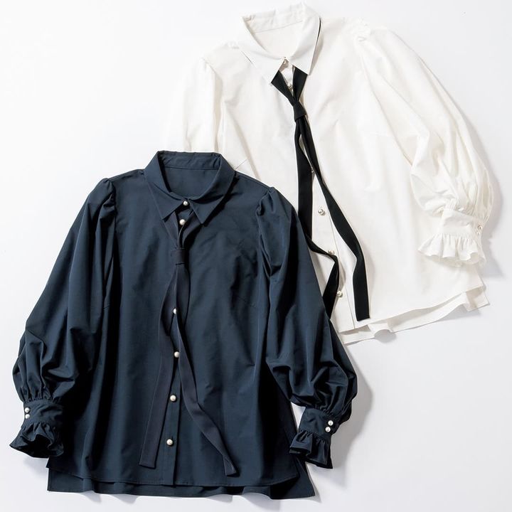ホワイトにはブラックのタイ、ネイビーには同色のタイが付属。タイを外してもパールやパフスリーブの盛りデザインで地味見えしません。ジャスト丈なので、デニムなどカジュアルなボトムスとも相性抜群。