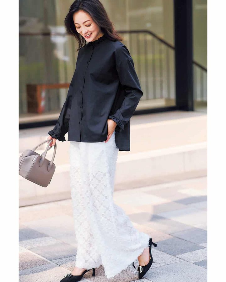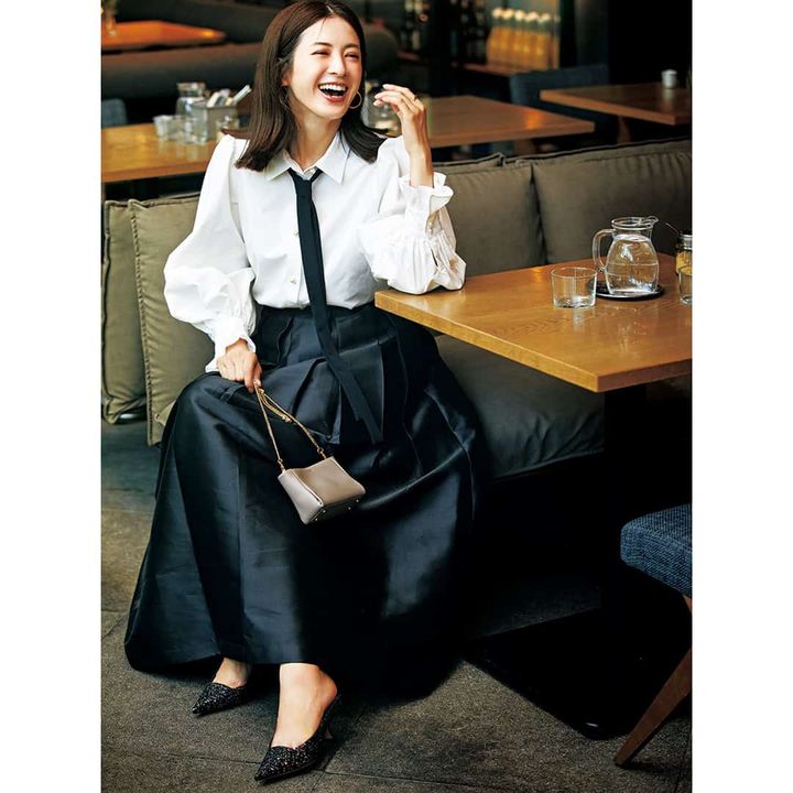 ブラウス¥16,500(スリースクエア)スカート¥12,800(ミドール)バッグ¥22,000(トーヴ/アンソロジー)ピアス¥11,000(ワンエーアールバイウノアエレ/ウノアエレ ジャパン)リング¥16,500(ココシュニック オンキッチュ/ココシュニック)シューズ(スタイリスト私物)