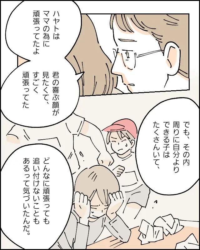 落ち込む私の隣に腰をおろした夫は「ハヤトはママのために頑張ってたよ。君の喜ぶ顔が見たくて、すごく頑張ってた。でも、そのうち周りに自分よりできる子はたくさんいて、どんなに頑張っても追い付けないこともあるって気づいたんだ」とハヤトがずっと悩み苦しんでいたことを静かに話し始めました。
