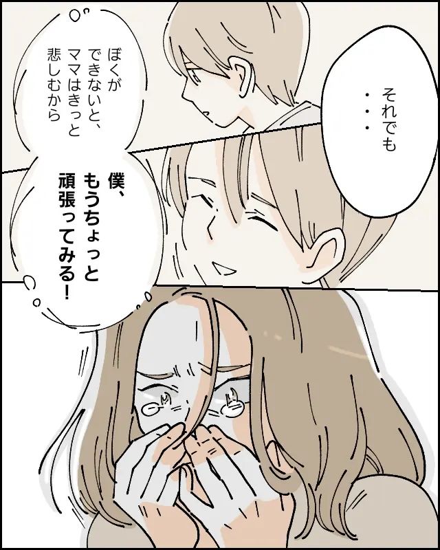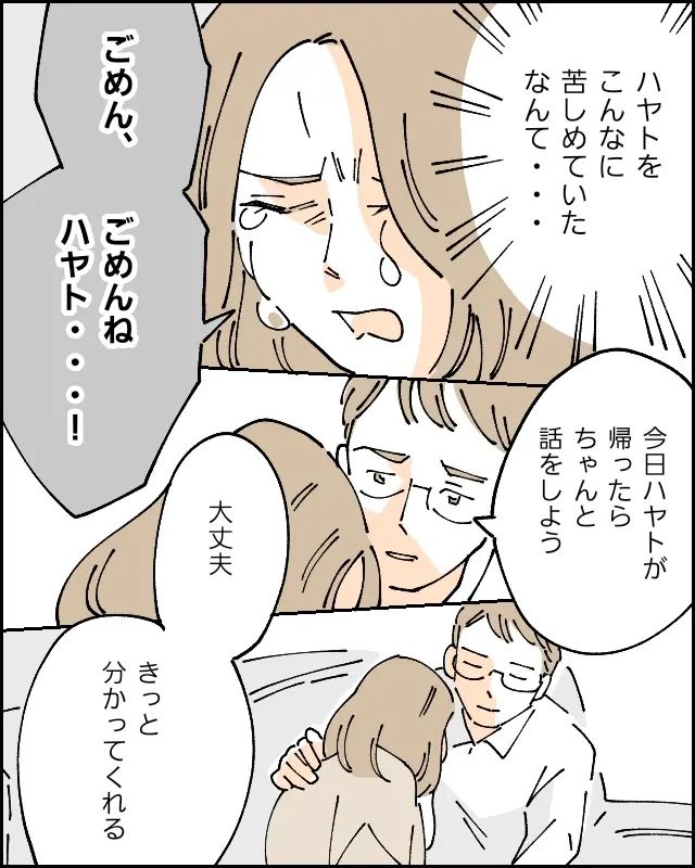ハヤトのために頑張っていると思っていたのに、こんなにハヤトを苦しめていたなんて・・。これまで「ハヤトならできる」と励ましていたつもりの言葉は、ハヤトにプレッシャーをかけ続けていたのです。「ごめん、ごめんねハヤト・・!」泣き崩れる私に夫は「今日ハヤトが帰ったらちゃんと話をしよう。大丈夫、きっと分かってくれる」と責めることなく優しく言ってくれました。