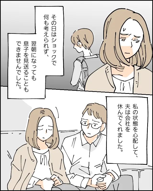 その日はショックで何も考えられなかった私。翌朝になっても気持ちの整理ができていなかった私はハヤトを見送ることもできませんでした。夫はそんな私の状態を心配して会社を休んでくれました。