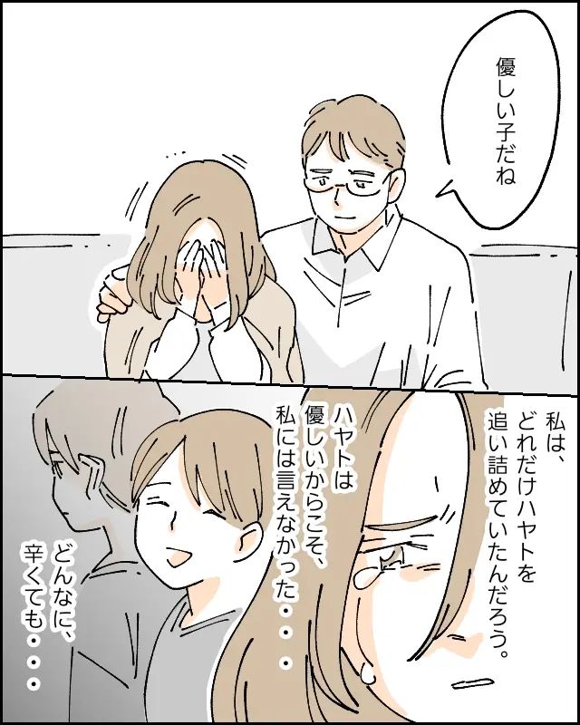 夫は私の肩をさすりながら「優しい子だね」とぽつり。私はどれだけハヤトを追い詰めていたんだろう。ハヤトは優しいからこそ、私には言えなかった・・。どんなに辛くても・・。できないと言ったら私が悲しむと思って言い出せなかったんだ・・。