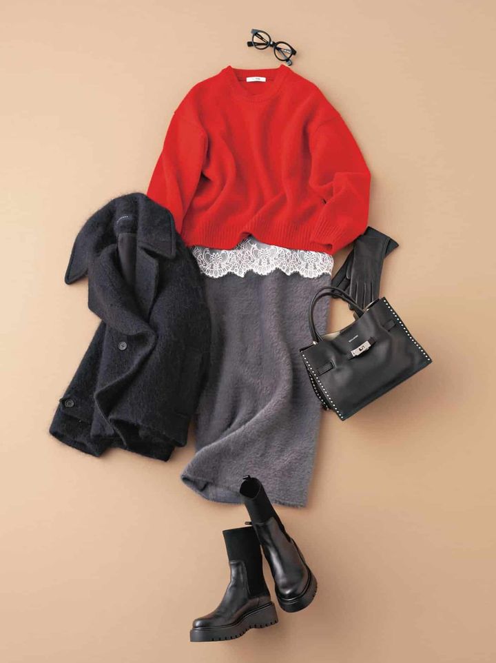 鮮やかな赤ニットで視線を惹きつけつつ、主張が控えめなミュートカラーのスカートで引き算を。切り替えラインにレースを挟んでメリハリをつけるのもポイントです。縦ラインを強調してくれるタイトな形も下半身のお悩みを解消する強い味方。