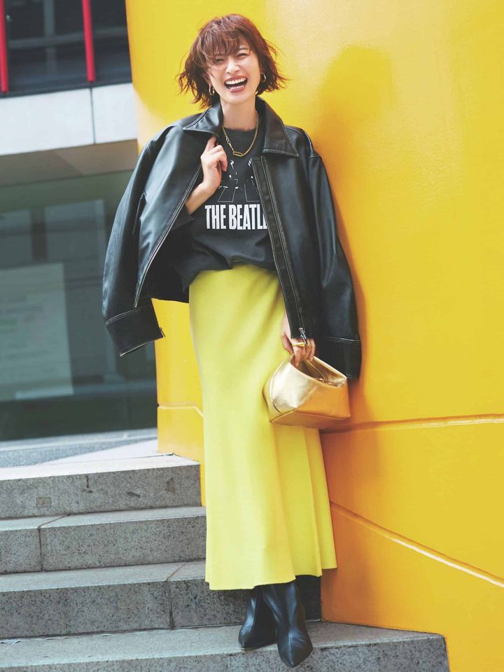 ジャケット¥39,600(メゾンスペシャル/メゾンスペシャル 青山店)Tシャツ¥6,380(GOOD ROCK SPEED/グッドスピード)スカート¥28,600(アルアバイル)バッグ¥70,400(ロンシャン/ロンシャン・ジャパン)ブーツ¥49,500(ペリーコ サニー/アマン)ピアス¥37,400ネックレス¥71,500(ともにブランイリス/ブランイリス トーキョー)リング[人さし指]¥15,400〈エムシー・スタジオ〉リング[薬指]¥10,340〈フル・オブ・グレイス〉(ともにズットホリック)