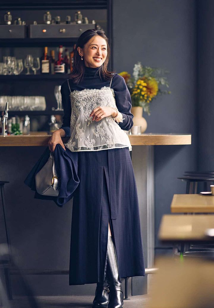 ニット×スカートのワンツーコーデにトレンドのレースキャミをレイヤードして華やかさと奥行きを加算。Iラインスカートで大人っぽさを損なわない甘さに。ベルト付きスカート¥53,900ニット¥31,900レースキャミソール¥99,000〈一部店舗限定〉ジレ¥198,000〈一部店舗限定〉(すべてエブール/リトルリーグ インク)バッグ¥162,800(J&M デヴィッドソン/J&M デヴィッドソン カスタマーセンター)ブーツ¥39,600(ダイアナ/ダイアナ 銀座本店)ピアス¥37,900〈リエスタジオ〉ブレスレット¥22,000(ともにアルアバイル)