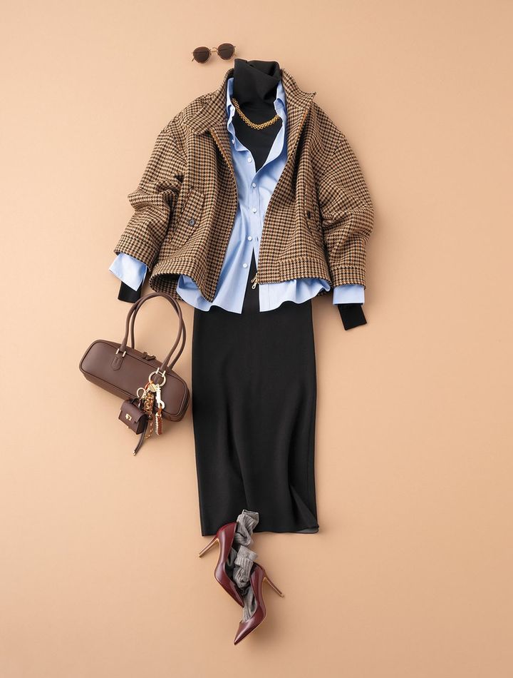 引き締め効果の高い黒のIラインスカートは、レイヤードスタイルに合わせるとそのボリュームの差が最大限に発揮されます。ボトムスで引き算することでレイヤードの仕上がりも際立ち、ウィンウィンなスタイリングに♡