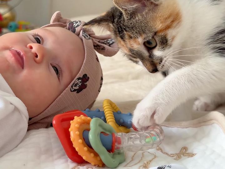 「触っても良いかにゃ」そっと手を伸ばす先には赤ちゃんのおもちゃ! 遊びたくてしょうがない子猫さん