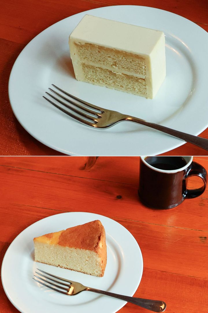 「サヴール洋菓子店」のスイーツは、ザクッとした食感と香ばしさが心地よい「ガレット」、素材の味わいを生かした「ガトー・オ・ブール」(写真下)、そしてバタークリームで包み込んだケーキ「ガトー・ア・ラ・クレーム」(写真上)の、人気の3種がメニューに並ぶ。