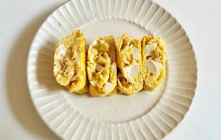 ちくわを入れることで魚介特有のうま味に加えて、食べ応えもアップし、青のりの風味も豊かな玉子焼きになりました。