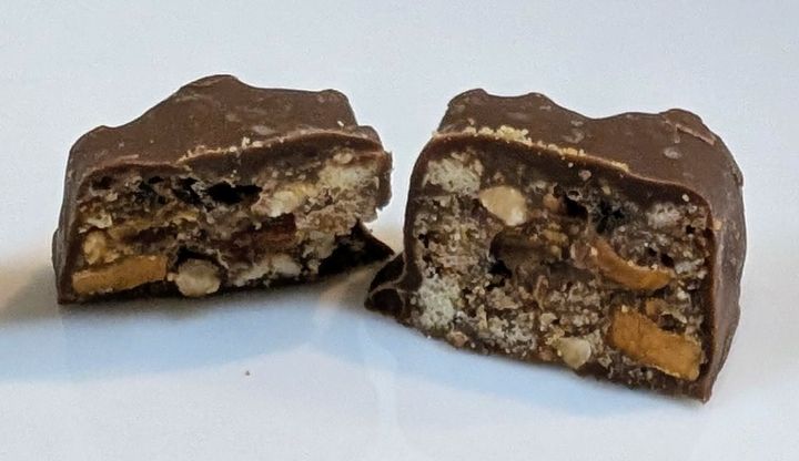 アーモンド、カシューナッツ、ヘーゼルナッツの3種のナッツを贅沢に使用。香ばしいナッツの風味とザクザク食感が特長です。ミルクチョコレートとビターチョコレートのブレンドチョコレートでコーティングした、コク深く豊かな味わいです。