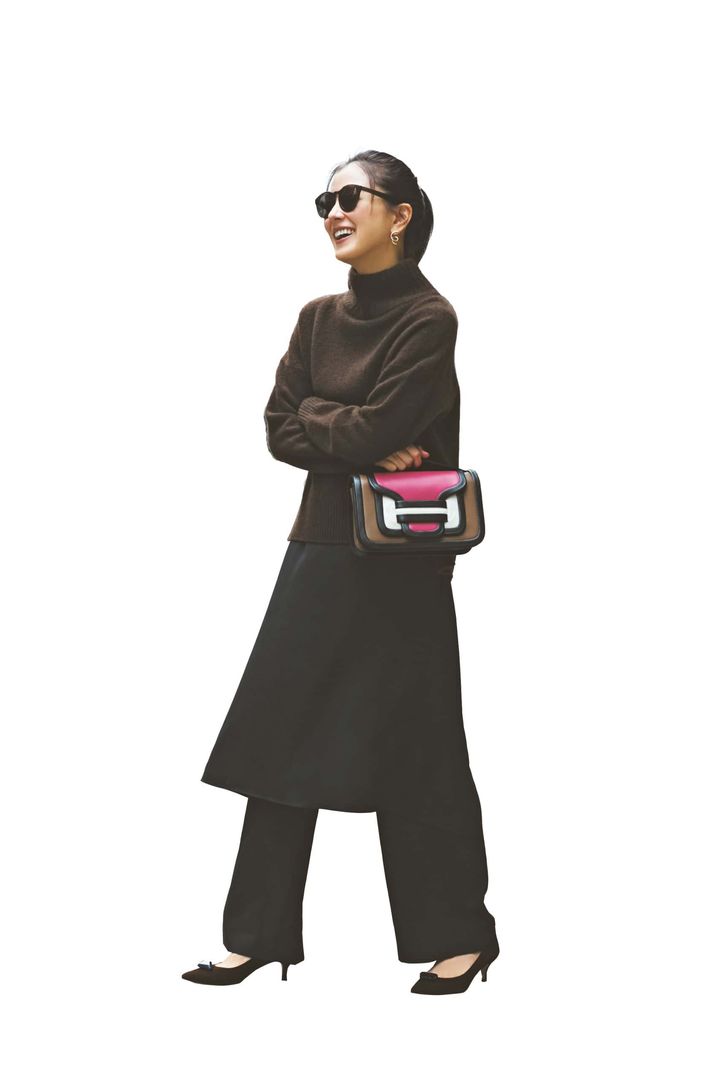 パンツ¥17,600(カデュネ/カデュネ プレスルーム)ニット¥31,900カーディガン¥36,300(ともにフローレント)バッグ¥75,900(マエストソ/アマン)靴¥36,300(ファビオ ルスコーニ/伊勢丹新宿本店 本館2階 婦人靴)ベルト¥12,100(レフィエ/プルミエ アロンディスモン NEWoMan新宿)メガネ¥42,900(アイヴァン/アイヴァン 東京ギャラリー)ピアス¥22,000リング¥18,700(ともにJouete)