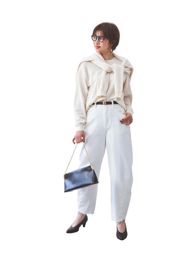 ワイドパンツの中でも、最旬なのがバレルシルエット。立体感のあるフォルムが全身ホワイトを洗練された印象に。ベルトが映えるハイウエストが、ニットスタイルをきりっと引き締めます。小物で黒を効かせればメリハリが生まれ、冬のマンネリ打破にも最適。