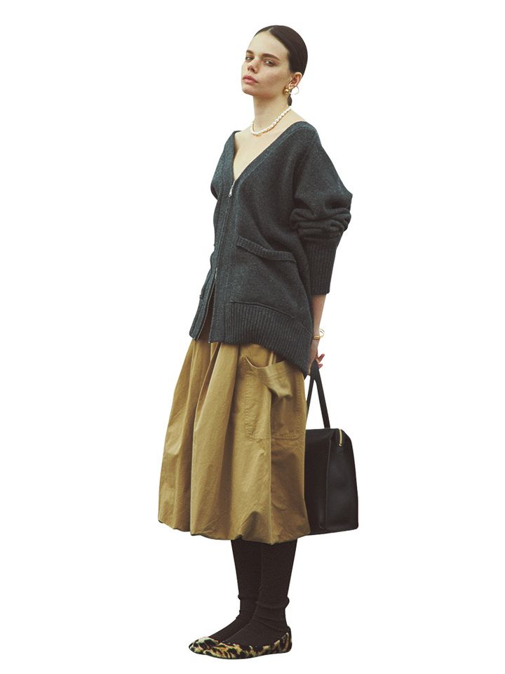 手ざわりのいい上質ウールの深Vネックカーディガン。そで、すそともにリブが長くとられており、オーバーサイズでも締まった印象に。着方を自在にアレンジできるフロントファスナー仕様。アウター未満のあたたかさで、春先までの活躍も期待できる。