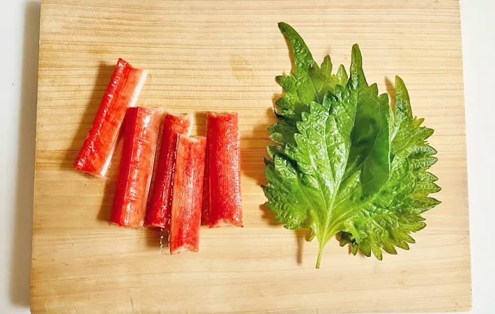 まずは下準備として、カニカマを1本ずつ、細く割き、大葉は千切りにしてください。