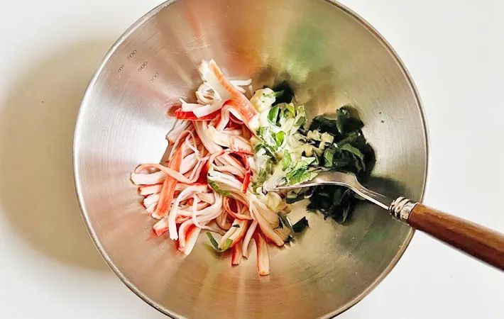 ボウルにカニカマと大葉を入れ、そこにマヨネーズを加えて混ぜ合わせます。