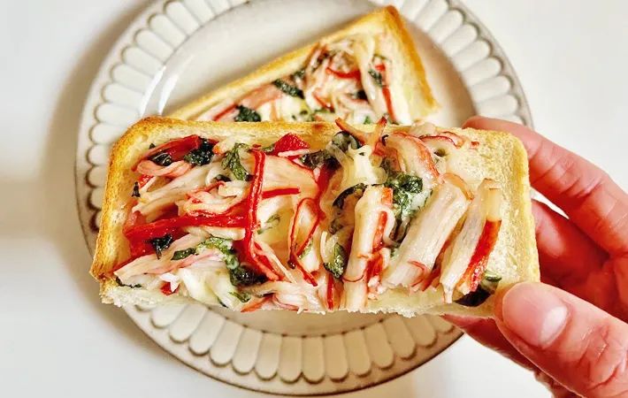 カニカマの濃厚な風味と大葉のさわやかな香り、マヨネーズとスライスチーズのコクが加わり、食べ応えのあるトーストになりました。