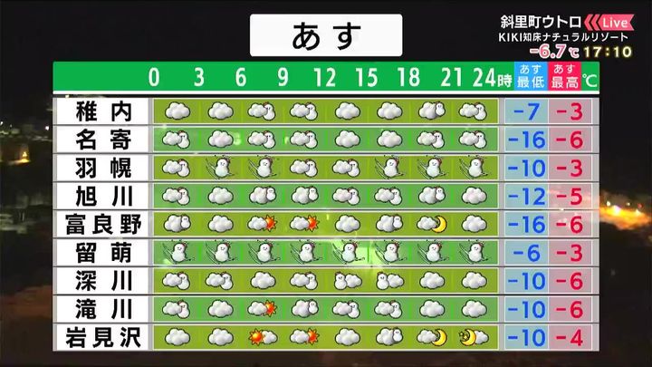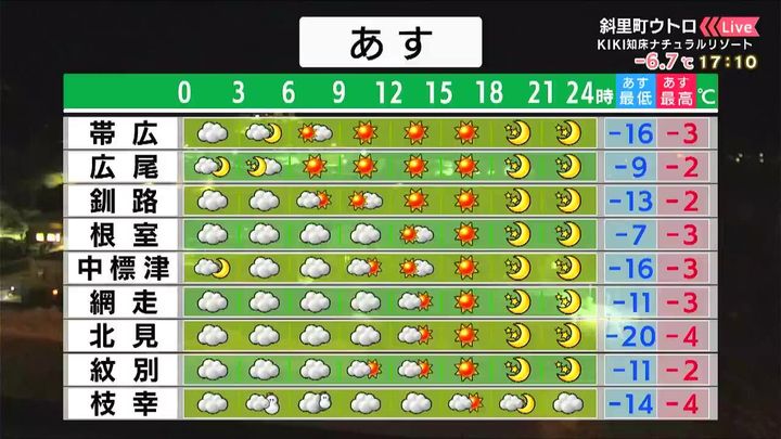 朝は曇り空で、道北の枝幸で雪が降るでしょう。午後は晴れる見込みです。朝は北見で-20度、十勝の陸別町ではあす23日(金)も-25度くらいまで冷え込みます。