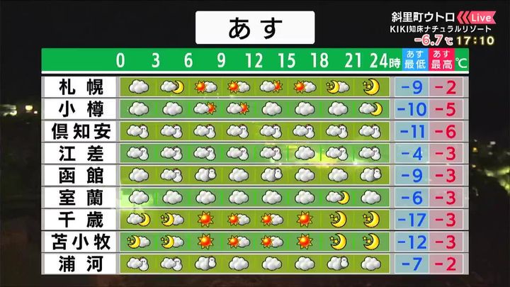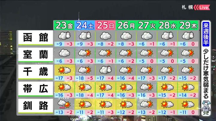 函館は曇りや雪ですが、大雪にはならないでしょう。東部は晴れて、土曜の朝は十勝の陸別町で-30度近くまで下がりそうです。来週後半は少しだけ寒気が弱まるでしょう。