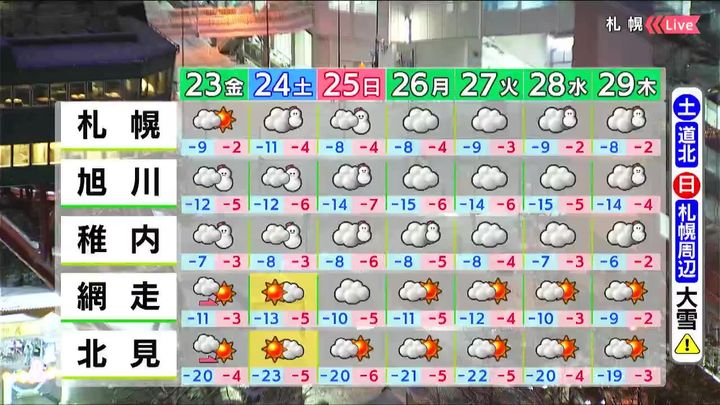 日本海側は雪が降り、道北で大雪になるでしょう。札幌周辺の雪はおさまる見込みです。気温はきょう22日(木)と同じかやや低く、倶知安の最高気温は-6度です。