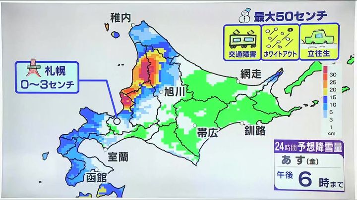 あすにかけては道北で大雪です。上川北部や留萌、北空知、石狩北部で紫色、30センチ前後の雪が降り、局地的に50センチの大雪です。交通障害や強い雪によるホワイトアウト、立往生にも注意して下さい。
