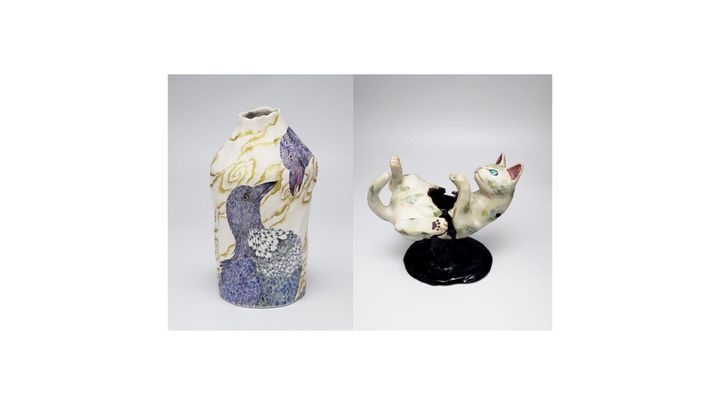 「2023年より活動を開始し、この度初めて二人での展示会を開催して頂くこととなりました。動物や植物を主なモチーフに制作しております。猫の円やかなかたちや体温、鳥の華やかさや軽やかさ、身近で蔓延る雑多な植物の生命力など、自分たちの感情を動かすものを表現できたらと思っています」(南紗貴子・理彦)