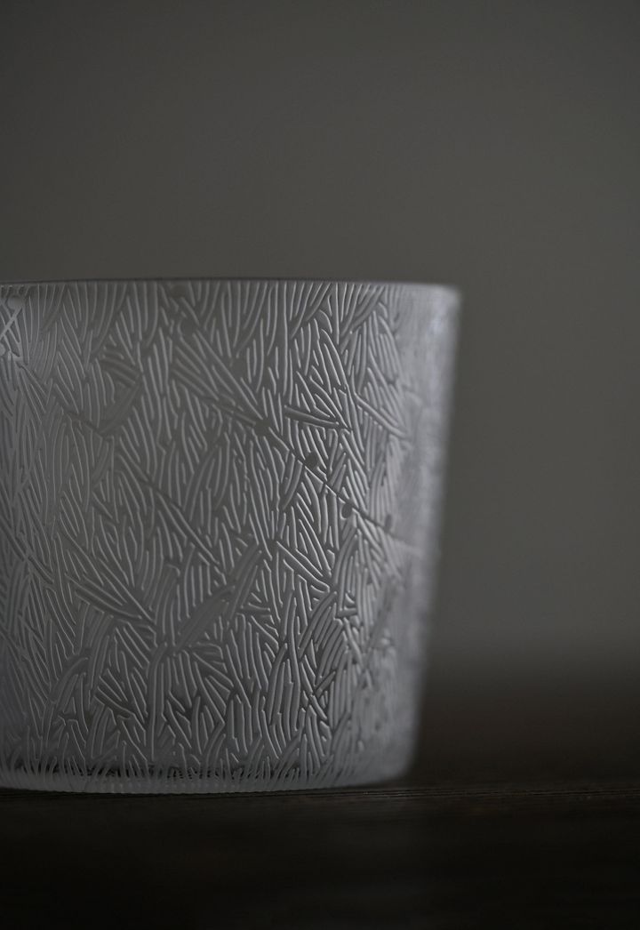 「ガラスの街富山で活動する三野さん。刻まれた模様は、生まれ育った土地や、現在の拠点などて見たり体感したりした、様々なものが混ざり合っているように感じます。お客様それぞれの記憶と結びつき、幾通りもの見立てができるでしょう。模様の影がつくる立体感と、独特の浮遊感のような軽やかさもあいまって、場や時間を美しく演出してくれる作品たちです」(Hase 店主)
